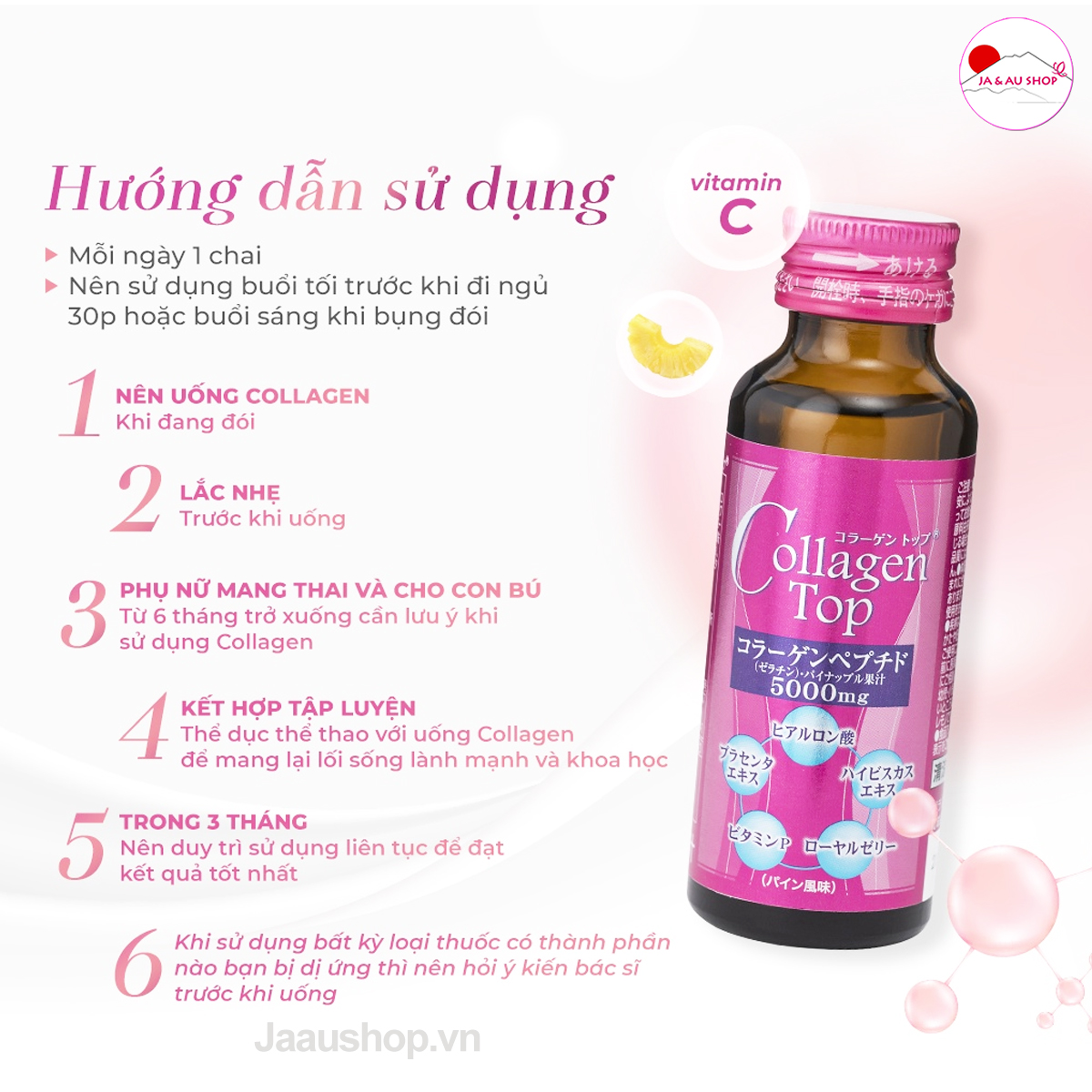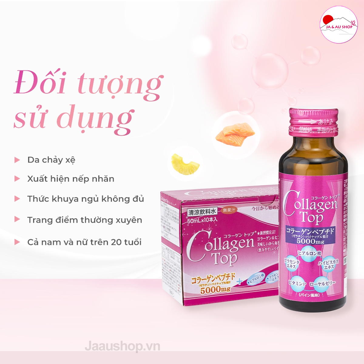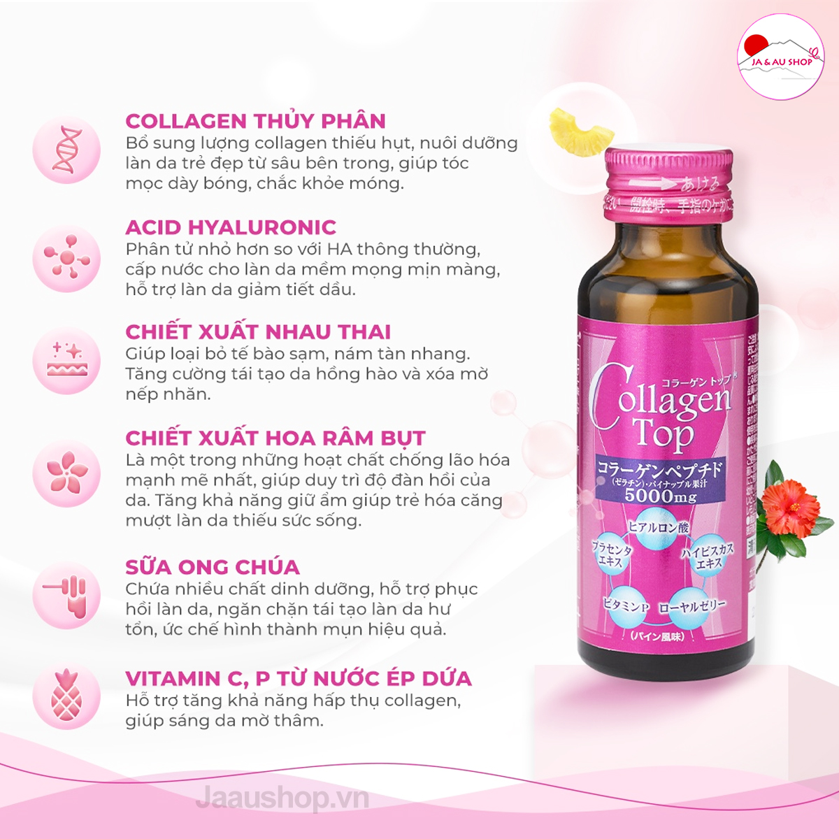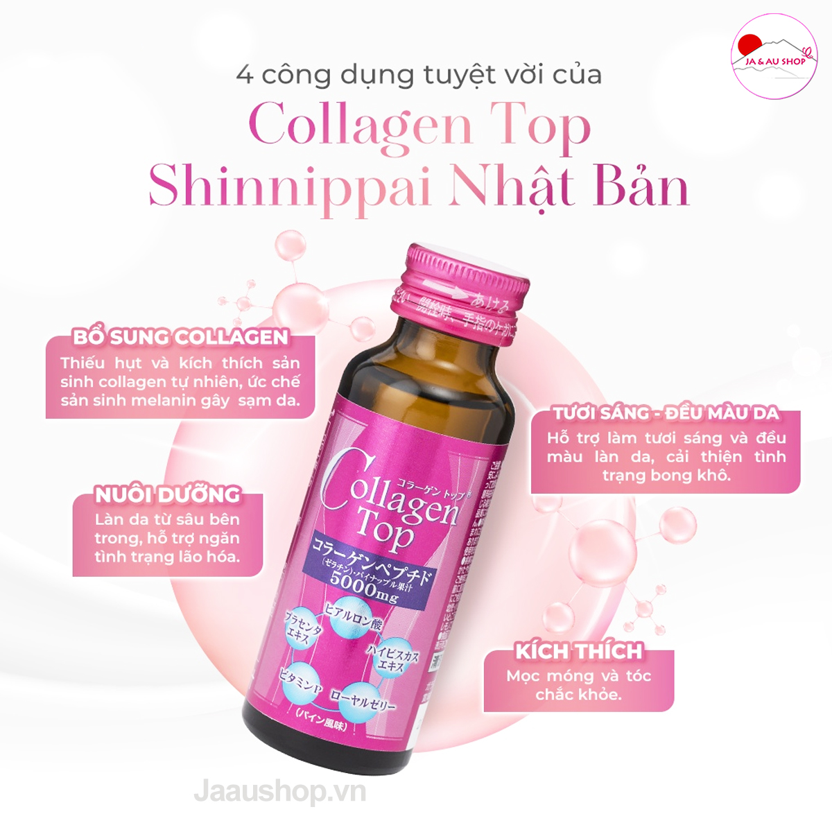 ➢ Nước uống bổ sung Collagen Top SHINNIPPAI 5000mg giúp bổ sung collagen. Giảm tình trạng thiếu hụt collagen và kích thích sản sinh collagen tự nhiên, ức chế sản sinh melanin gây sạm da.