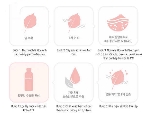 ✔ Với quy trình 6 bước cầu kỳ từ khâu thu hoạch đến khâu chiết xuất và đóng gói sản phẩm, đã làm nên một bộ sản phẩm hoa anh đào hoàn hảo nhất, mà chưa có hãng mỹ phẩm nào áp dụng công thức trên, Innisfree là hãng mỹ phẩm tiên phong trong việc chiết xuất Hoa Anh Đào.